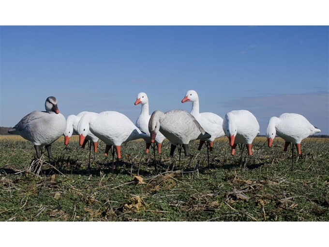 This newly designed, single unit, high definition snow goose pack will stack geese on the ground! Realism has been taken to the next level! Sold per eight-pack. No removable heads. The Full-Size Variety Pack comes with 4 snow feeders, 1 juvenile feeder, 2 snow sentry’s and 1 juvenile rester. Once assembled, the decoy and base system act as one complete unit...which makes setting-up and moving decoys a breeze. Higdon's unique 3-position base system allows for natural decoy movement, even in varying wind conditions.