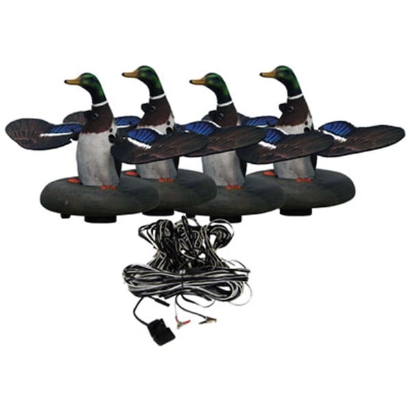 The Floating Flasher 2 Plug-N-Hunt base unit consists of a main-wire that runs a distance of 60 feet from your blind/hunting location then splits off into four separate wires, each with different lengths (10 foot, 20 foot, 30 foot and 30 foot;). Attached to the very end of each wire are our new Floating Flasher 2 decoys; which flash/flaps its wings every time the bumper switch is pushed. If you prefer not to use the manual bumper switch add the optional HW Floating Flasher 2 Timer listed below for continuous intermittent realistic motion.