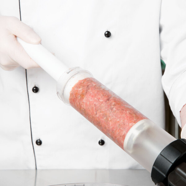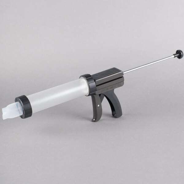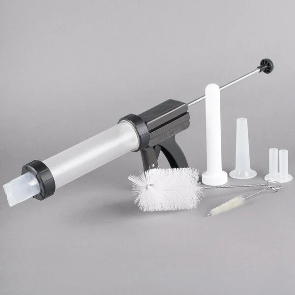 Create delicious jerky and sausage with the Weston 37-0260-W 1 lb. Jerky Gun Jr.! This jerky gun can hold up to 1 lb. of meat at a time, and its easy-squeeze trigger makes it a breeze to create delicious snacks throughout the day. The included plastic attachments let you create double jerky strips, double snack sticks, and sausage with ease. It comes with a stomper to help you maximize the amount of meat you can fit in the gun.